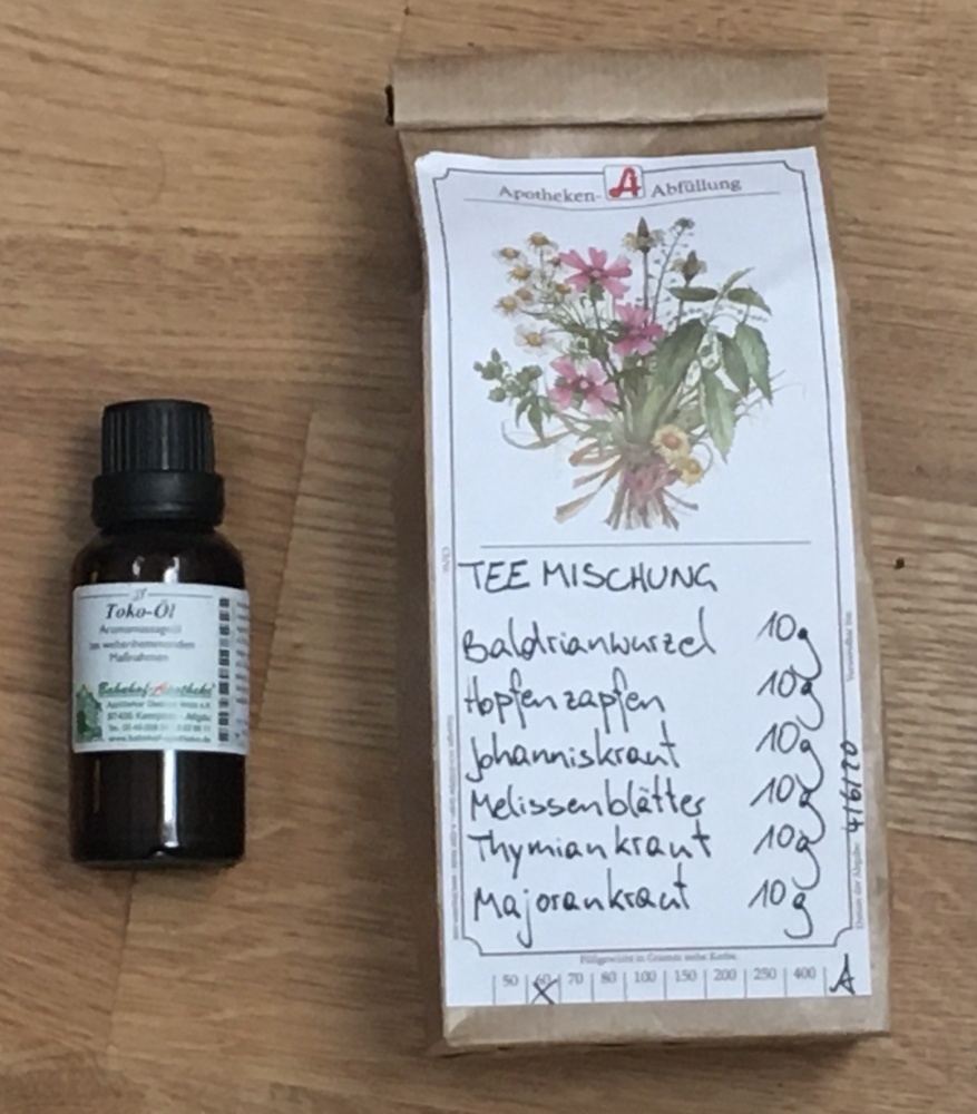 Verkaufe Paket bestehend aus Toko-Öl (Stadelmann) und Hebammentee Baldrian (Stadelmann) um 5 Euro (beides schon offen, aber beim Öl sind noch etwa 2/3 drinnen und beim Tee noch mehr!) - kann gegen vorzeitige Wehen helfen 🙂